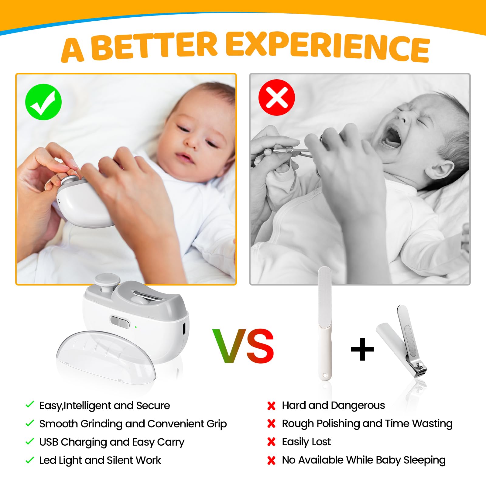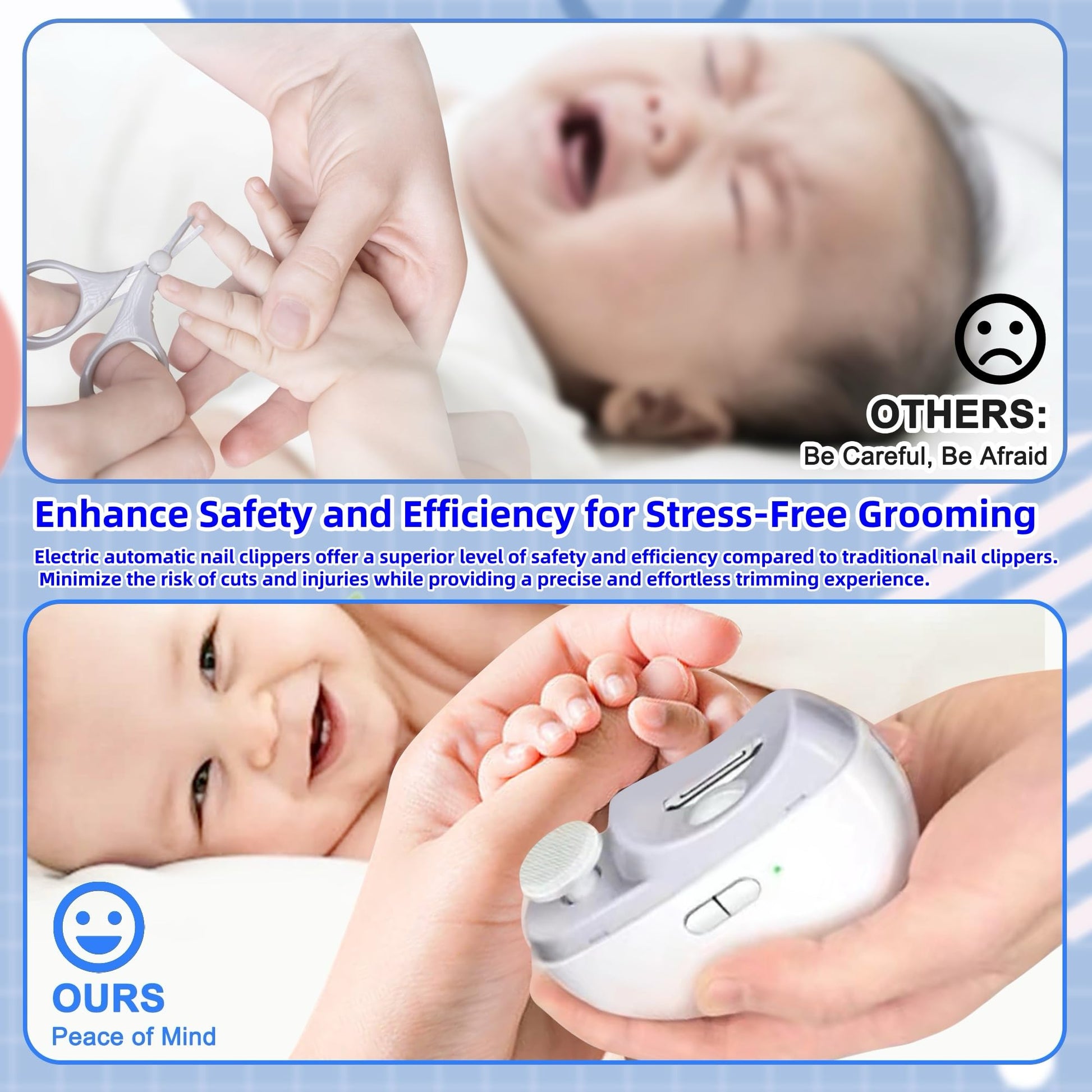 Our Electric Nail Clipper is equipped with a soft LED auxiliary light and operates at a low noise level, so you don't have to worry about waking your sleeping baby while you trim their nails.